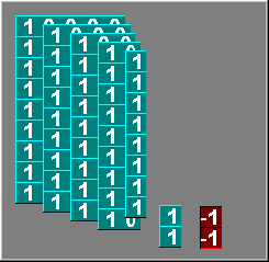In figure 8 the operation considers. By the properties of cards, 5 negative cards of unit are annulled, with the 5 positive units of the 25 (figure 9). A ten is decomposed in its units (Figure 10) and are annulled the positive and negative tens, and the 3 corresponding negative units with the positive ones. Result: 7.